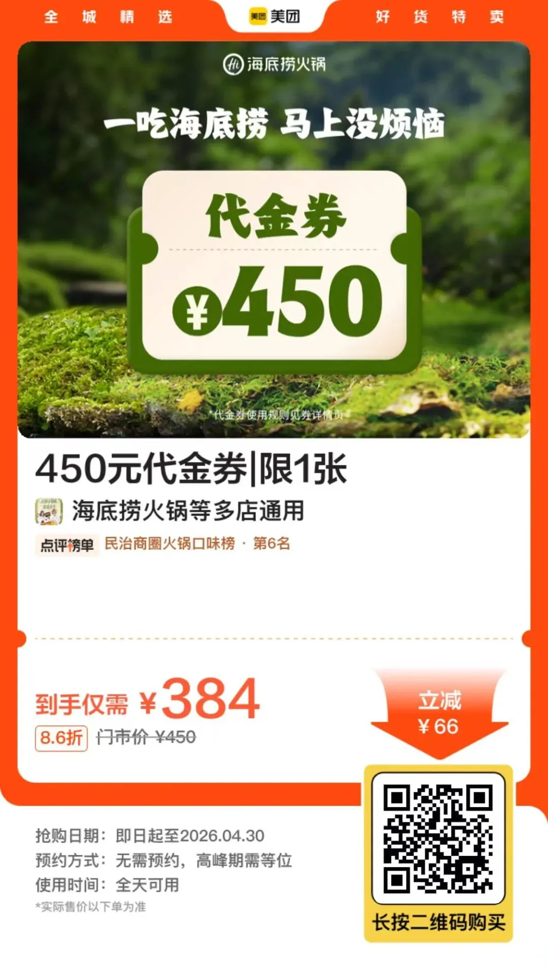 如果您是吃货,还没有囤券的习惯,小编建议您见到非常实惠的券赶紧囤起来,你的资金并不会直接到商家手上,所以不用担心商家跑路等情况。所有购买的券均在美团账户,随时可以退,秒到,没有任何后顾之忧。