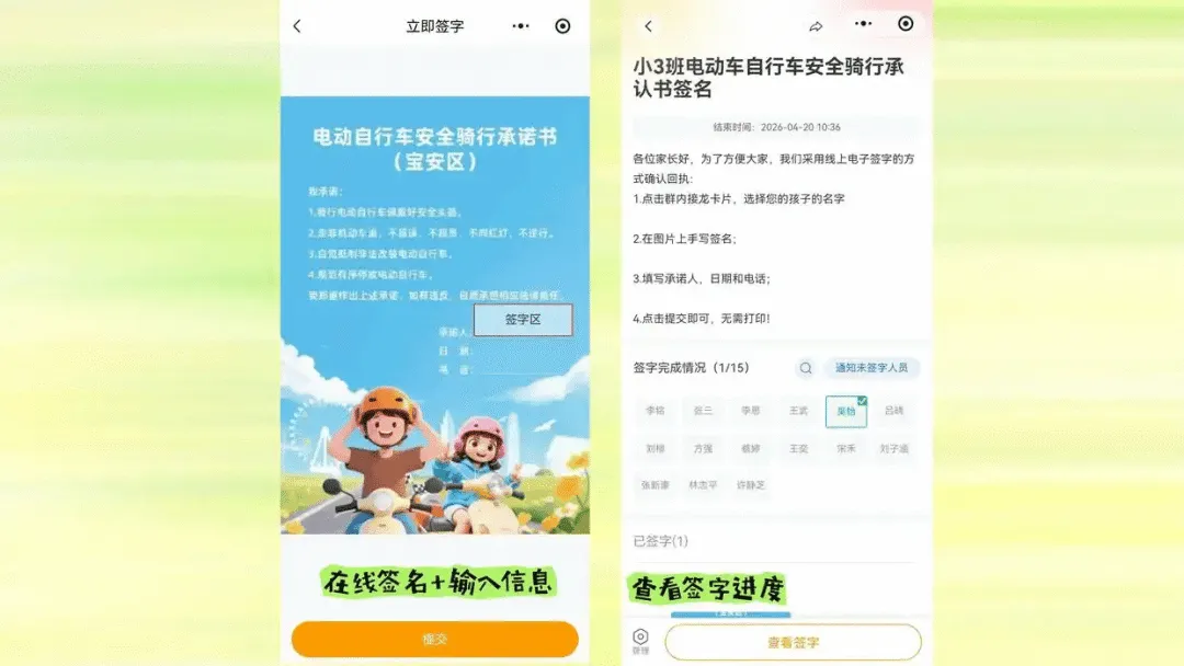 以前,社区收集居民签名,要打印大量文件,安排社工挨家挨户走访,居民不在家就得多次上门,签好的文件还要一张张扫描存档,效率很低。学校发给家长的告知书,让学生带回家签字,第二天再带回,总有学生忘记、弄丢,老师还得反复催促、逐一整理。