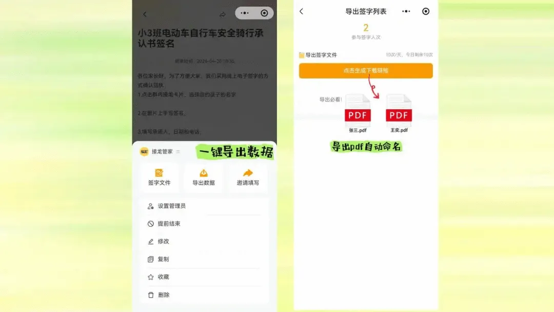 老师或社区工作人员只需把政策文件上传到接龙管家,设置好签字区域,生成链接发到群,家长或居民点击链接就能在线手写签名提交,全程不到 30 秒。