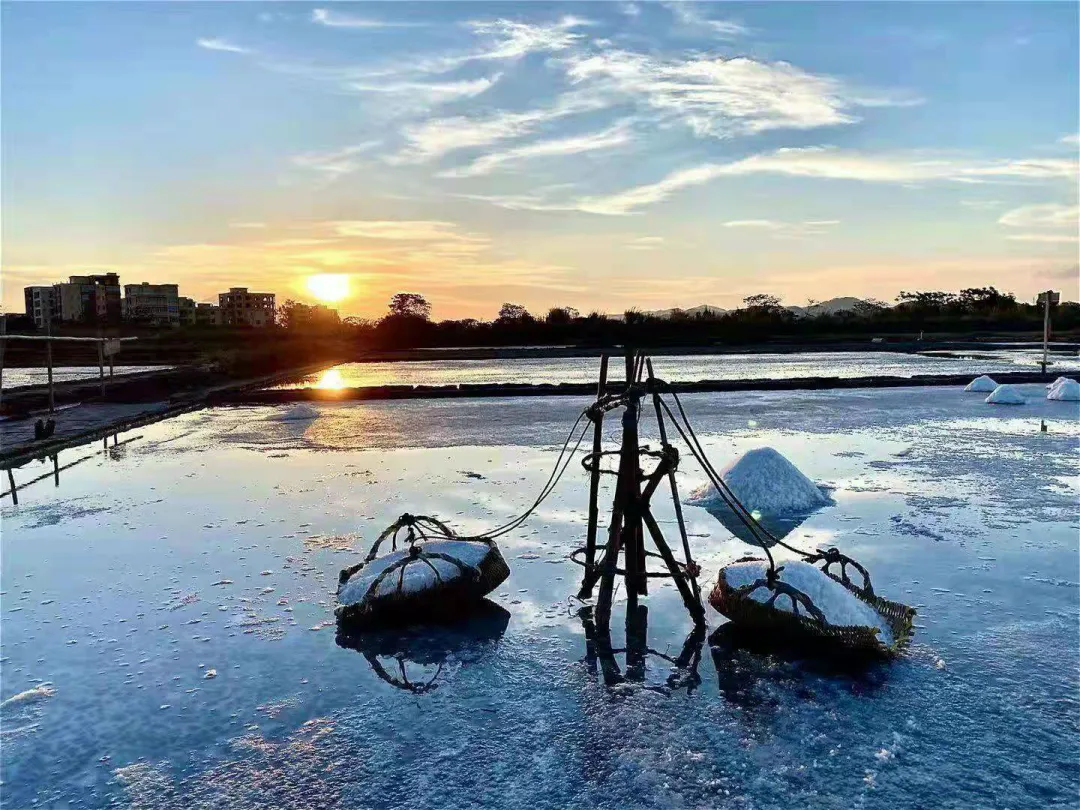 盐洲岛之所以称为“盐洲岛”,是因为当地有着三百多年的制盐历史。一块一块的盐田,错落有致盐田远望象一面镜子,镜子上一堆一堆白雪般的盐堆,吸引人的目光,远远地望去,更像一副水天合一的美好画卷。