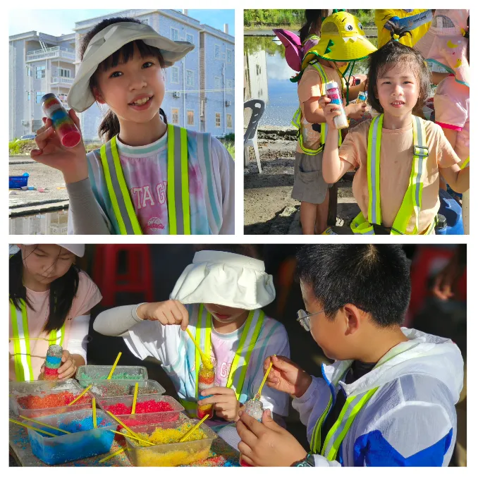 拾完贝壳,进入最治愈的手工创作环节,没有固定的模板、没有严格的要求,孩子们发挥想象,将捡拾来的贝壳串起一串灵动的贝壳风铃,让海风一吹,就能听见大海的声音!