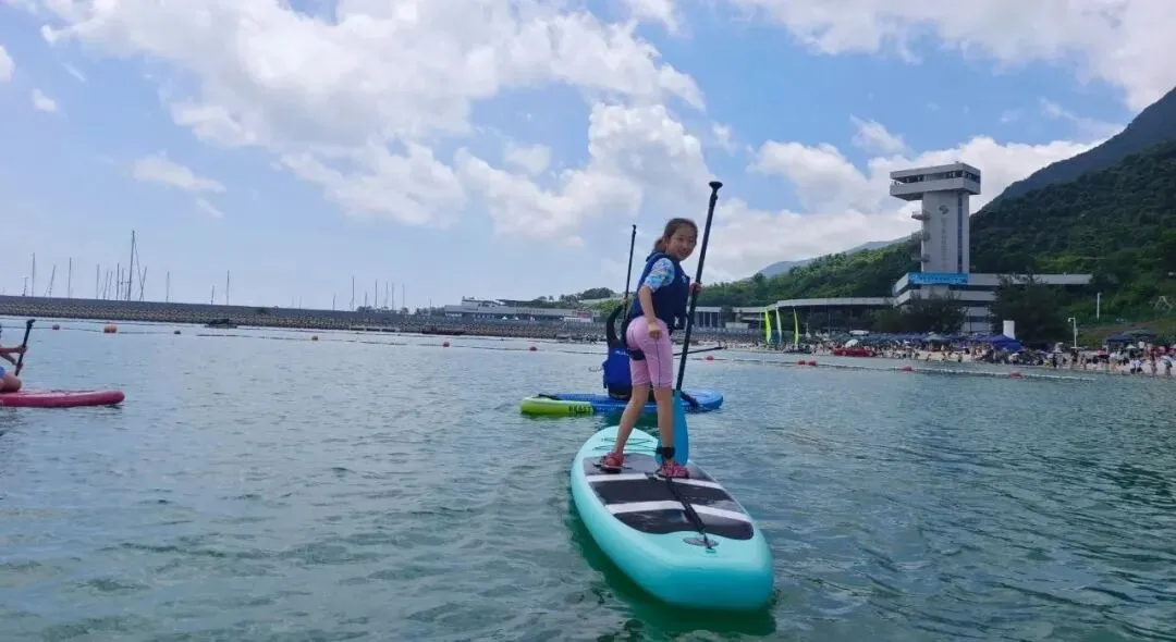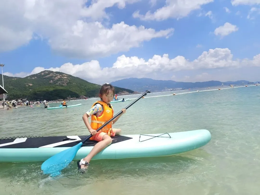 桨板亲水性强,安全,易玩、好玩,我们曾带着孩子在海中、江中、水库中都去玩过桨板,不同的水域玩桨板的感受不同。这次在盐洲岛的大海中挑战桨板,让孩子去感受大海波浪的律动,去对抗变幻的风向,这是一次对海洋的挑战。
