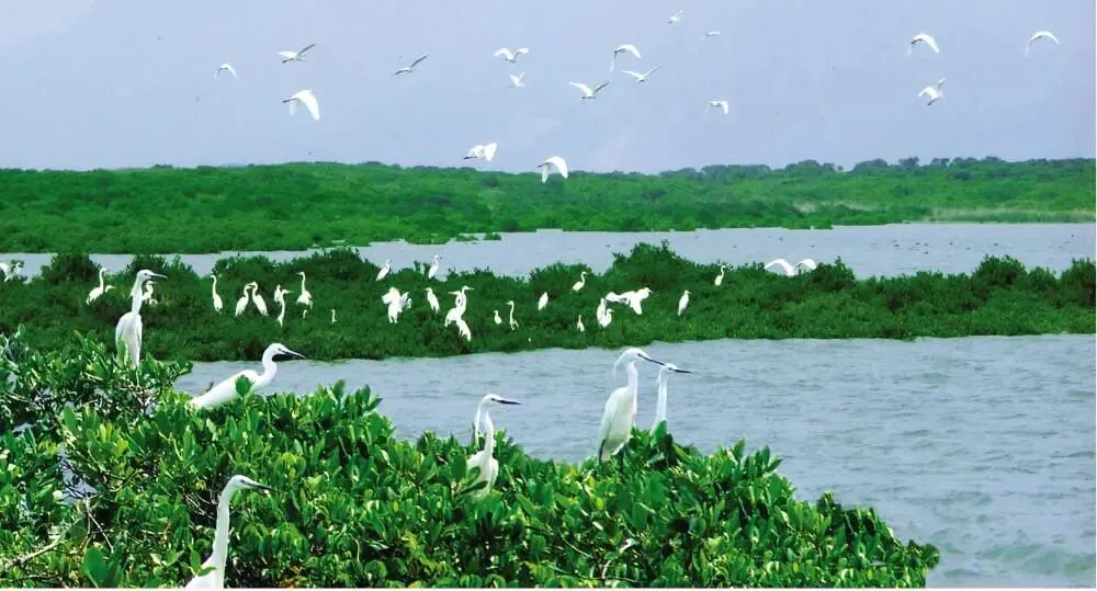 盐洲岛沿岸有红树林面积约2000亩,红树林中栖息了苍鹭、黄嘴白鹭、金斑行鸟等17种候鸟共计3万余只,被誉为“鹭鸟天堂”。