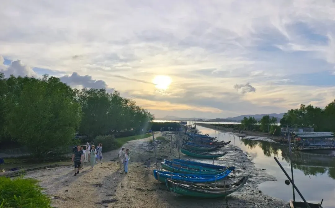 夕阳西下,落日余晖印照在波光粼粼海面上,与红树交织,映出了油画般的渔岛美景...