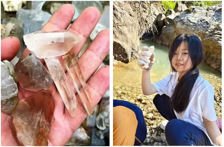 水晶不是长在岩石上的吗?这些水晶从哪里来的呢?孩子们的好奇心被激起,围着老师问个不停。原来是生长在岩洞里的水晶因为地壳运动或岩石风化掉落,被雨水和河流冲刷到了水里。