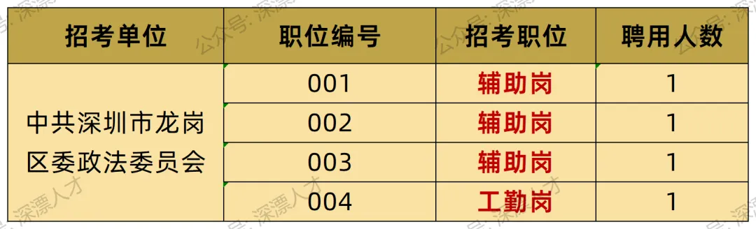 深圳市优才人力资源有限公司拟于近期面向社会公开招聘4名编外聘用人员,派遣至中共深圳市龙岗区委政法委员会工作。现公告如下:
