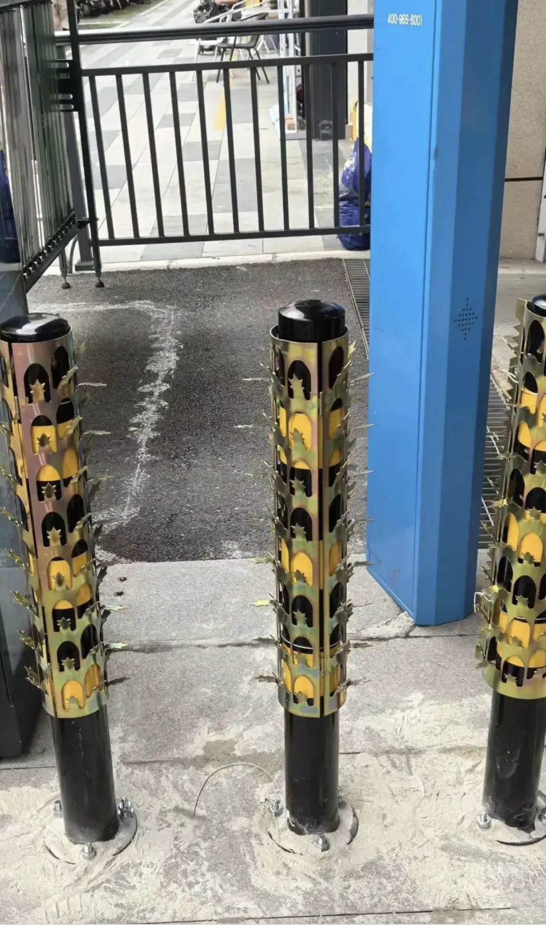 “那些‘倒刺’确实有点危险,当天刚装上去后不久,就有业主投诉,我们很快就处理掉了。”保安表示,目前物业已重新定制了专用围栏,到货后会替换现有地桩。“在闸口装围栏还是有必要的,时常有人穿行,有时劝阻效果也有限。”