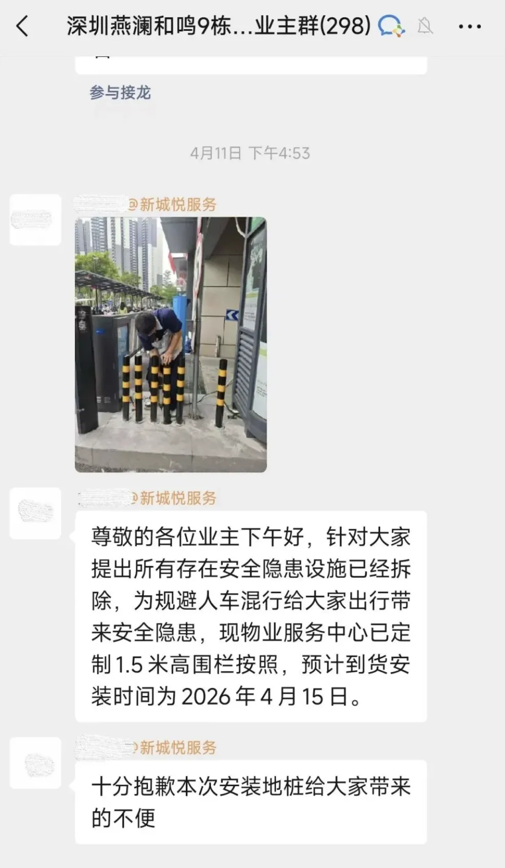 业主提供的微信聊天记录截图显示,4月11日下午,小区物业负责人在9栋业主群留言致歉:“存在安全隐患的设施已经拆除,为规避人车混行给大家出行带来的安全隐患,物业服务中心已定制1.5米高的围栏,预计到货安装时间为2026年4月15日。十分抱歉本次安装地桩给大家带来的不便。”