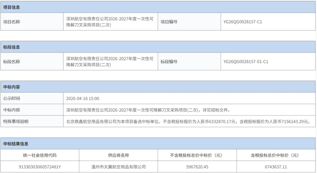 深圳航空有限责任公司2026-2027年度一次性可降解刀叉采购项目(二次)中标结果公示。