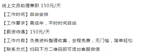 招聘深圳球赛扫码拉新兼职工作要求:20-40岁,男女不限,能说会道,性格外向大胆的,敢跟人搭话交流的工作内容:现场发放礼品,引导球迷扫码添加微信好友工资:底薪70元,超100个的部分,每成功添加一个好友1元/个,上不封顶(一般三四百很正常)工作时间:4月21日 15:00-19:00工作地点:深圳市体育中心体育场(深圳市福田区笋岗西)报名本微信或:zy6206666