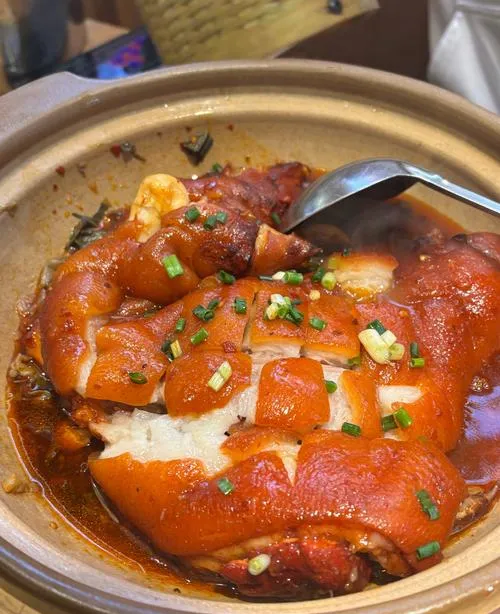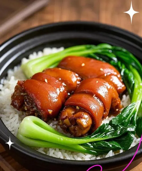 这道卤猪脚饭是粤式经典,用到了多种家常香料慢炖。从中医角度看,猪脚搭配八角、桂皮等温性香料,能温通血脉、驱散寒气。做出来的猪脚色泽红亮,入口即化,肥而不腻,瘦肉丝丝分明。配上热米饭,淋上一勺浓稠的卤汁,每一口都软糯黏嘴,吃完感觉肠胃暖暖的,浑身上下都舒坦。特别适合在寒冷的傍晚,一家人围坐在一起享用。