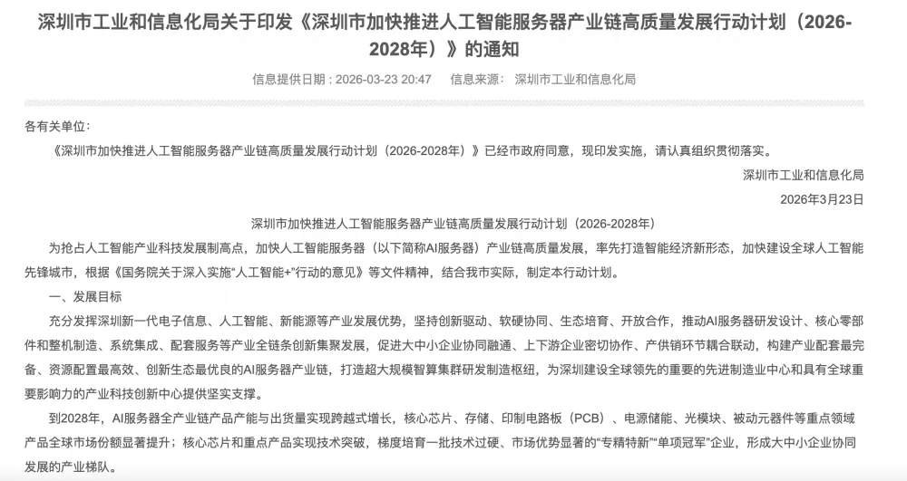 (八)AI服务器整机。依托深圳整机研发制造与生态配套优势,发展全液冷AI超节点、高端AI训练服务器、AI推理服务器、大模型训推一体机等核心产品,积极布局轻量化AI一体机、迷你主机等产品;支持发展液冷CDU等服务器集群连接系统,做强做大整机集成产业,提升ODM/OEM/JDM多元化制造服务能力,构建覆盖设计、制造、测试、交付的全链条服务体系,培育具有全球影响力的AI服务器整机品牌。