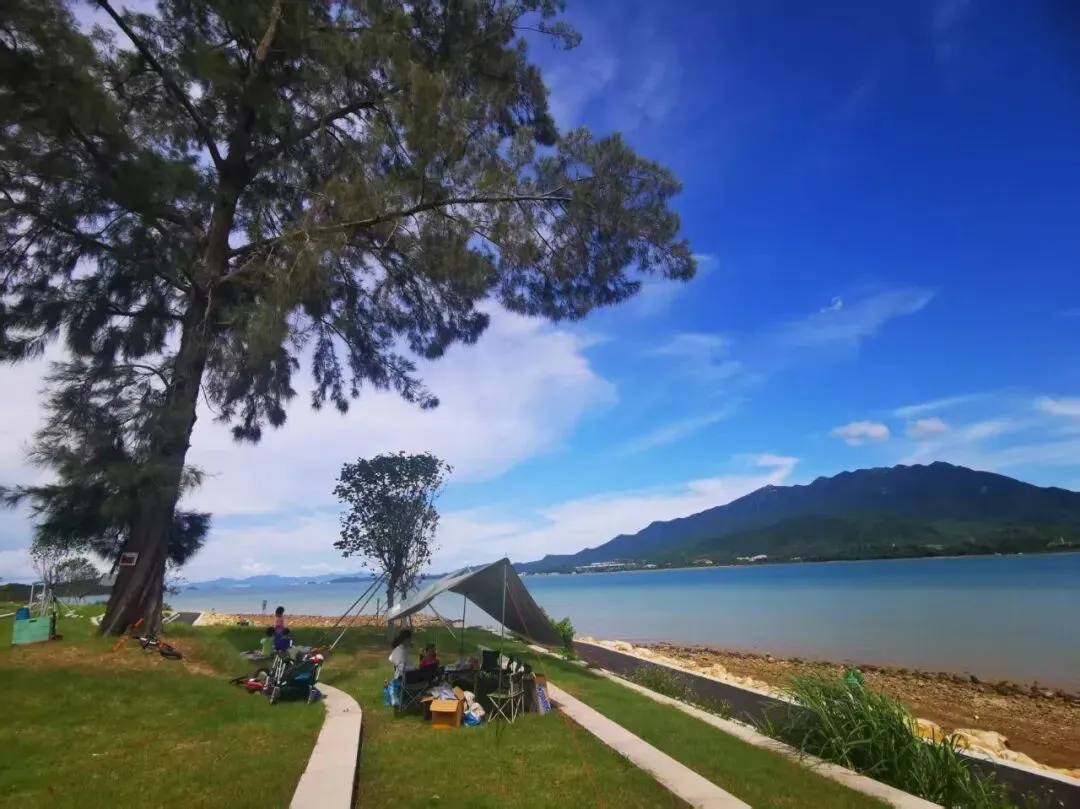 它和坝光银叶湿地其实隔岸相望,同一片海。这里超适合低龄宝宝,贝壳特别多,而且岸边有大片草地,可以放心搭帐篷吹吹风,娃自己就能玩得不亦乐乎,重点还有干净的厕所。