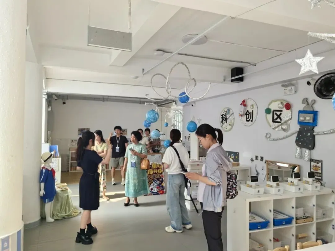 在教学副园长李惠萍和保教主任郑依涵老师的带领下,参访教师分成两组,深入探访了金湖的每一处“会说话”的环境。走进教室,不同风格的班级教室带来了不一样的感受,幼小衔接、罗湖印象、环境改造等主题的项目课程体现着幼儿参与设计的影子。楼梯与公共区的环境以中华优秀传统文化与信息技术为锚点,将公共区作为幼儿拓展认知与体验的又一学习场所。“叽里呱啦露营吧”、“米米乐园”、“魔法剧场”等既是幼儿活动的户外场地,又是孩子们引以为傲的项目作品。