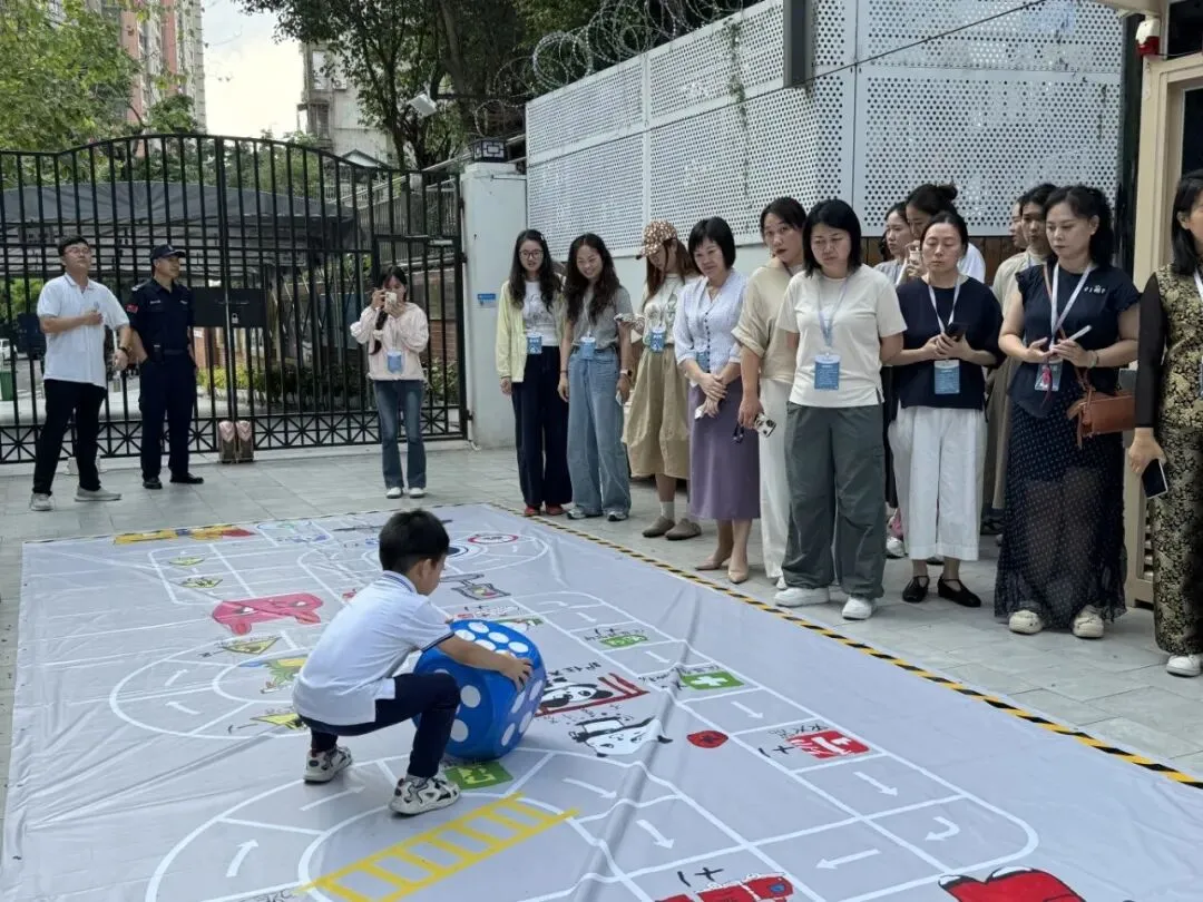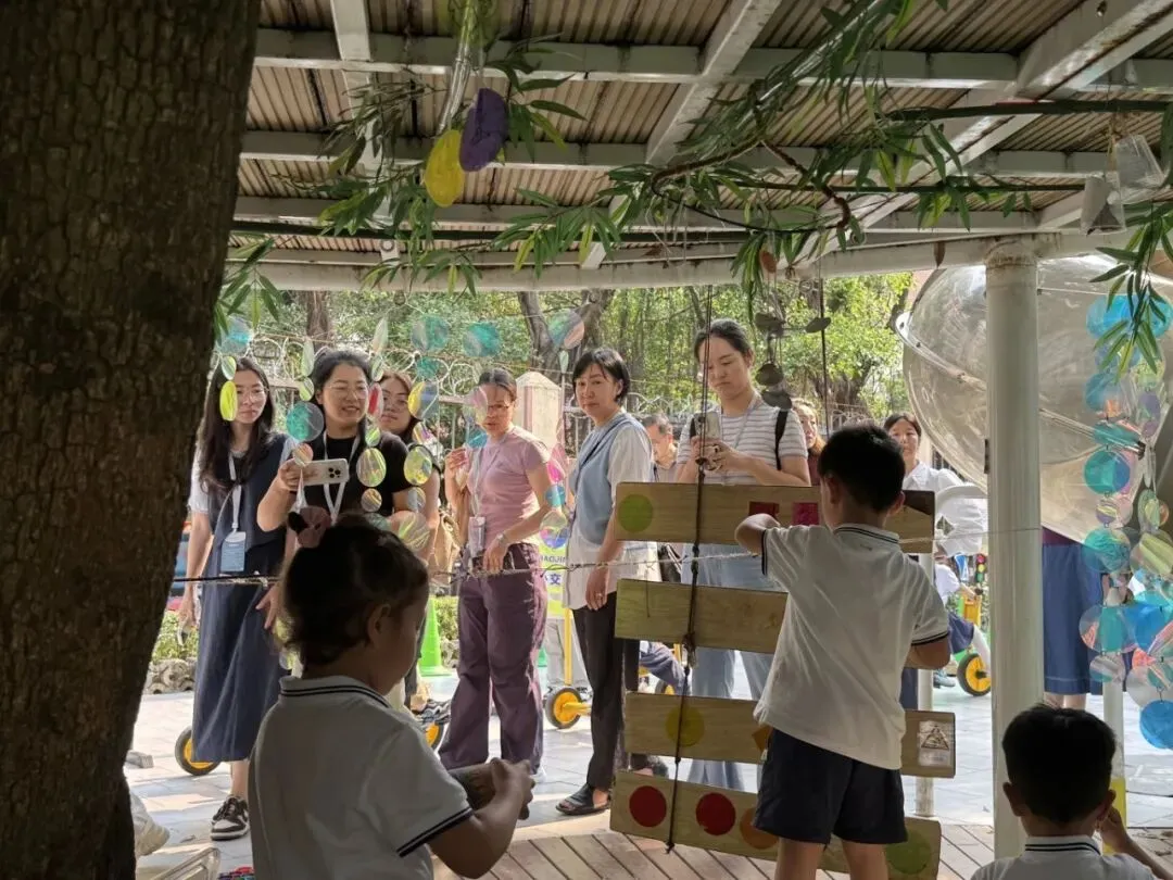 从环境到游戏,当空间真正属于儿童,学习便自然发生。沙池深处,“小工程师”们调试管道、观察水流,时不时传来“我们需要更多的水来固定沙子”的讨论声;建构区里,合作与分歧、尝试与调整,幼儿们正合作搭建校园建筑,每一块积木的摆放都蕴含着他们对空间的理解与想象;在综合区,一场关于汽车制造的实验悄然发生,“谁搭的车可以载更多人;几辆车能不能拼在一起呢?”幼儿们的想法与创意正在征服在场的每一位教师。参访教师们纷纷拿出手机记录下这些生动的瞬间,并时不时与班级教师交流,班级教师耐心解答,分享着日常观察方法与支持策略。