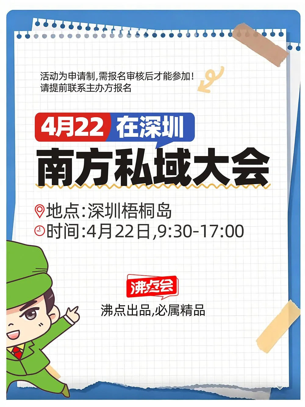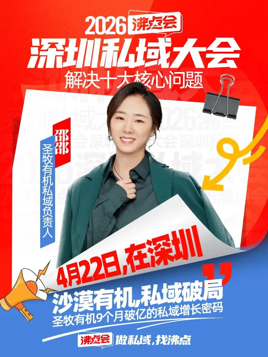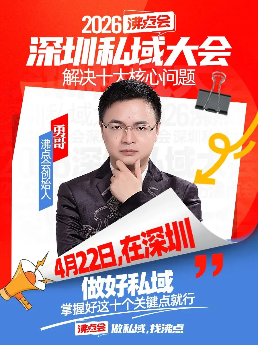 沸点会深耕私域赛道多年,见证了无数品牌从 0 到 1、从区域到全国的私域增长。我们始终相信,私域不是玄学,而是一套可学习、可复制、可落地的商业方法。4 月 22 日,深圳见。和我们一起,把 12 大品类的私域玩法、从底层逻辑到落地实操的干货一次学透,解决你私域路上的所有难题,让私域真正成为你品牌的增长引擎。>>> 即刻行动 <<<