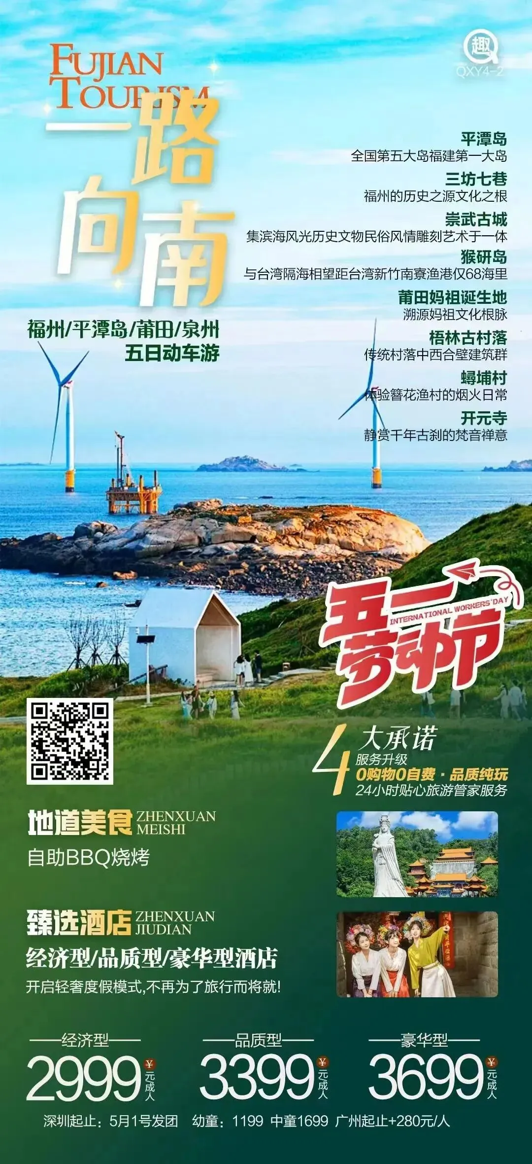 早餐后,车赴莆田秀屿区山亭乡,贤良港天后祖祠位于福建省莆田市秀屿区山亭乡港里村。妈祖神像港里,古称贤良港,亦名"黄螺港",是海上女神-----妈祖的诞生地,妈祖羽化后,乡人建祠纪念。公元960年农历三月廿三海神妈祖在港里诞生。贤良港是海上女神--【妈祖的诞生地】(游览时间约1小时)。妈祖羽化后,乡人建祠纪念。祖祠始建于宋代,今祠内保存有宋代妈祖宝像,清乾隆石刻碑记及附近的"妈祖故居"、"受符井"、"八封井"、"连础面柱"等宋代文物。1989年辟为"莆田县贤良港天后祖祠旅游区",1991年福建省人民政府公布为省级文物保护单位。后游览【蟳埔渔村】(游览时间约1小时)走进渔村,四处散发出一股海的味道。余晖下的蚵壳厝是动荡不安的出海男儿心中最温暖的港湾,那里承载着几百年渔民的安静的岁月。也是2023年新晋的网红打卡胜点,明星赵丽颖同款浔埔扎花体验地,有兴趣的可以在这里感受扎花,拍上美美的照片。【网红美食推荐打卡-泉州西街】(游览时间约1小时)泉州美食必吃:肉粽、姜母鸭、石花四果汤、牛肉羹、咸饭、春卷、醋肉、肉燕、洪濑鸡爪、崇武鱼卷、土笋冻等泉州打卡必走:小西埕这些网红打卡点不走妄来闽南。参观网红打卡小西埕;【开元寺】(游览时间约1小时)位于福建省泉州市鲤城区西街,是中国东南沿海重要的文物古迹,也是福建省内规模最大的佛教寺院。该寺始创于唐初垂拱二年(686年),初名莲花道场,开元二十六年(738年)更名开元寺。现存主要庙宇系明、清两代修建,南北长260米,东西宽300米,占地面积78000平方米。后入住酒店。第四天 | 惠女风情园-西沙湾沙滩-崇武古城 餐:早住宿:泉州酒店 |