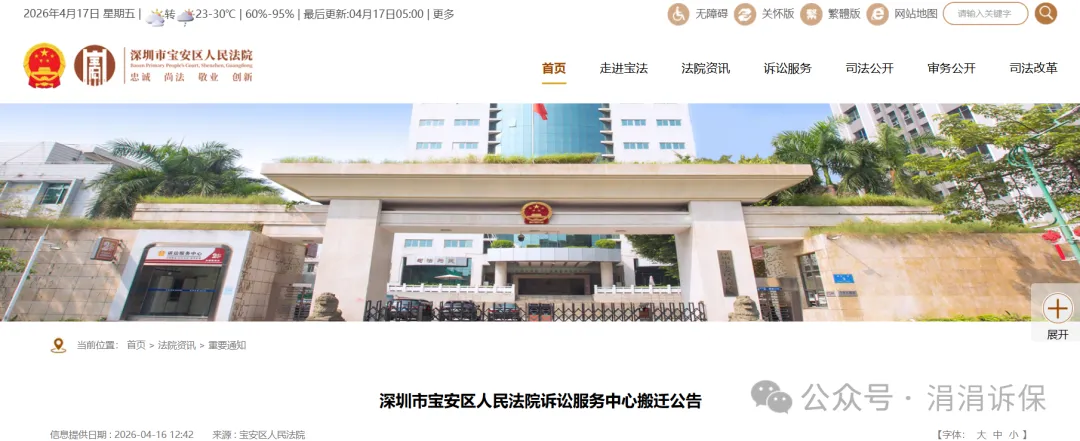 深圳宝安法院诉讼服务中心搬迁公告(自2026年4月20日开始于新址办公)