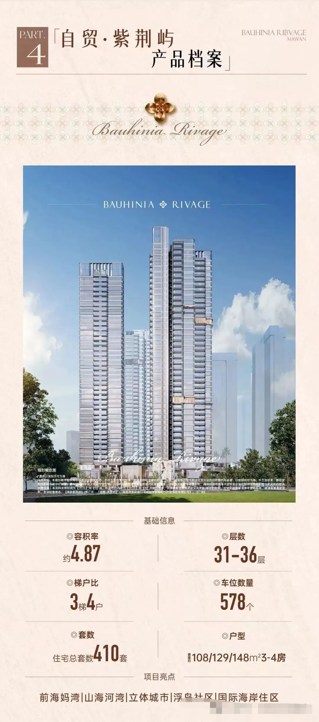 亮点:前海妈湾核心纯改善新规住宅;地铁5号线妈湾站约300米;使用率超90%开盘时间:预计2026年4月19日(星期日)位置:南山区前海妈湾片区听海大道与妈湾二路交汇处,紧邻妈湾绿廊、月亮湾公园产品:3栋36–41层超高层住宅,建面约108–129–148㎡三至四房,共410套,精装交付价格:备案均价 约10.78万/㎡,备案总价约1080–1776万亮点:前海妈湾一线临海住宅;双地铁+高定精装;招商“臻系”高端作品