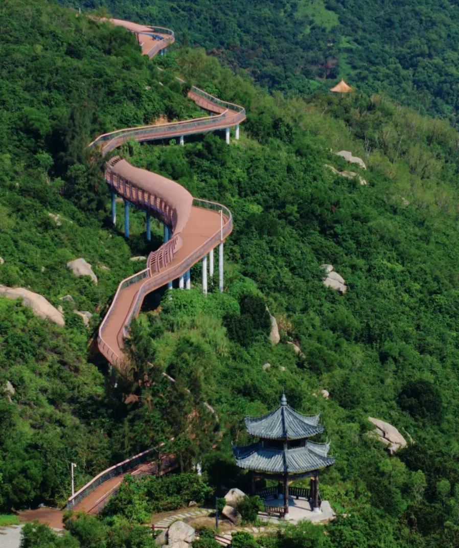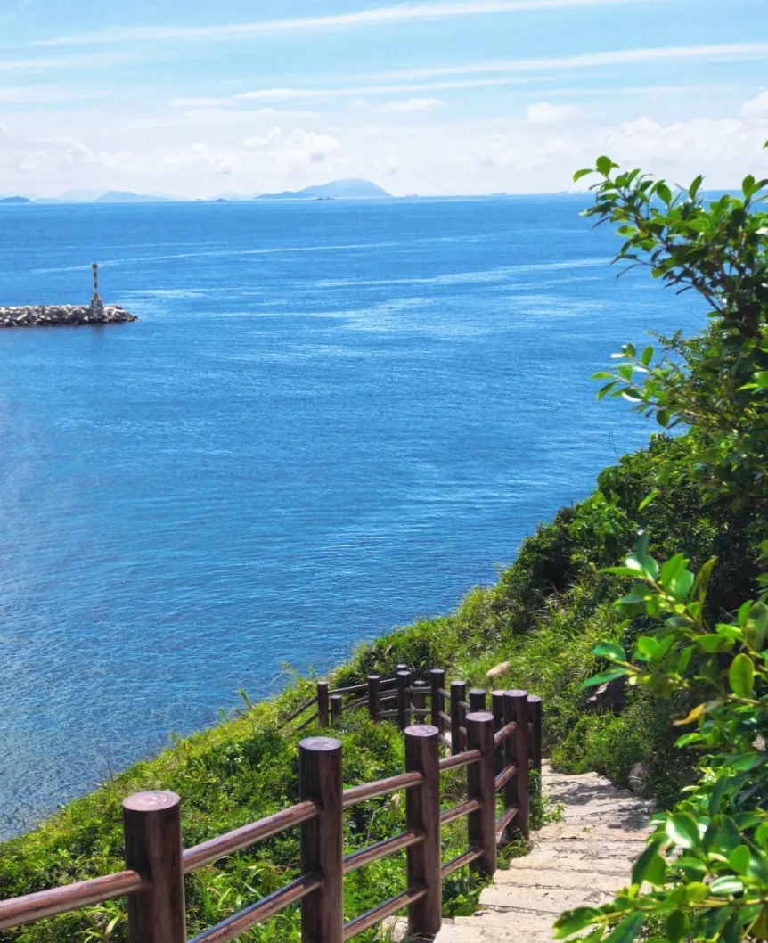 除了沙滩,国内首条离岛滨海栈道也一定要去,栈道平缓好走,全程没有陡坡,老人孩子都能轻松走完,沿途设有悬空玻璃观景台,站在上面能全方位欣赏海岛风光,一边是青山,一边是大海,