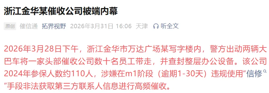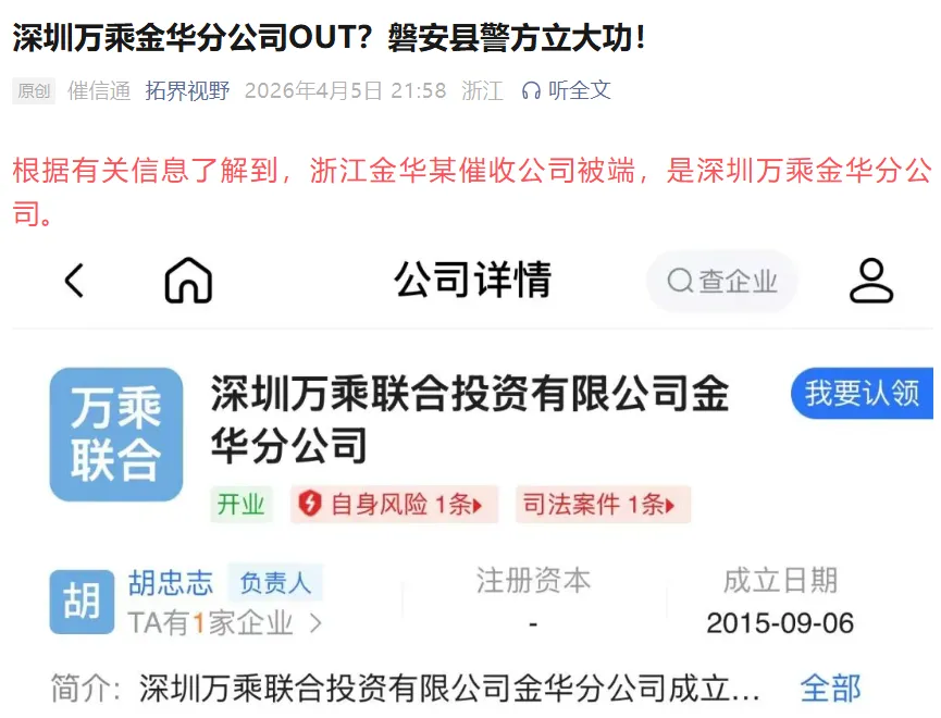 深圳万乘金华分公司案,这起案件是2026年3月28日由浙江金华磐安县警方破获的,因非法获取超10万条公民信息并使用“软暴力”催收,一家催收行业头部公司被“一锅端”。