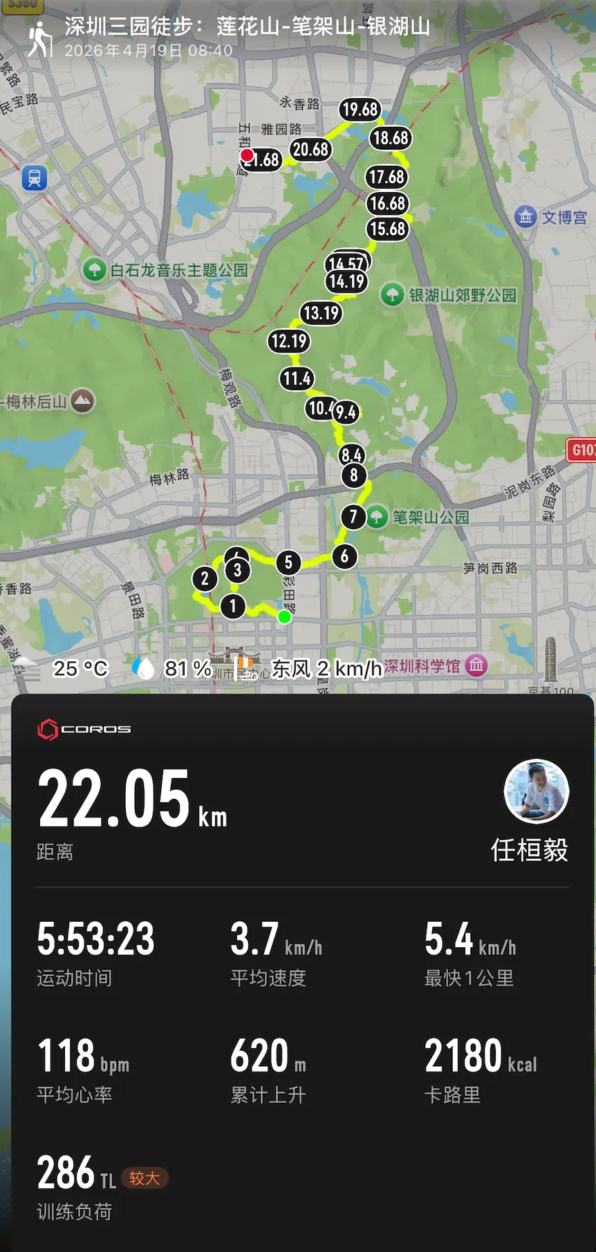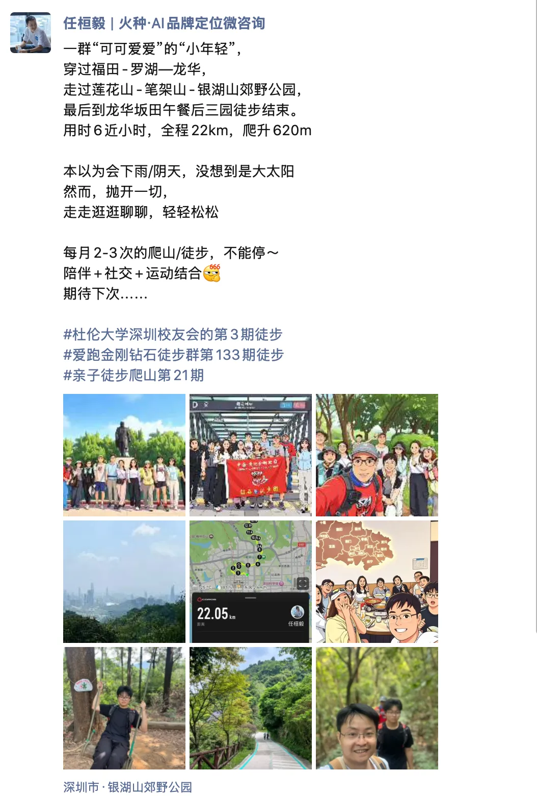 这周日凑了个超开心的局:既是杜伦大学深圳校友会的第3期徒步,也是爱跑金刚石徒步群的第133期活动,还顺带把孩子带上一起走,加上个亲子陪伴第 21 期。一群"可可爱爱"的新老朋友,从福田莲花山出发,穿笔架山,跨银湖山,最终走到龙华坂田,走完全程22.05公里,累计爬升620米,用时近6小时,走完一身透汗,整个人都通透了。