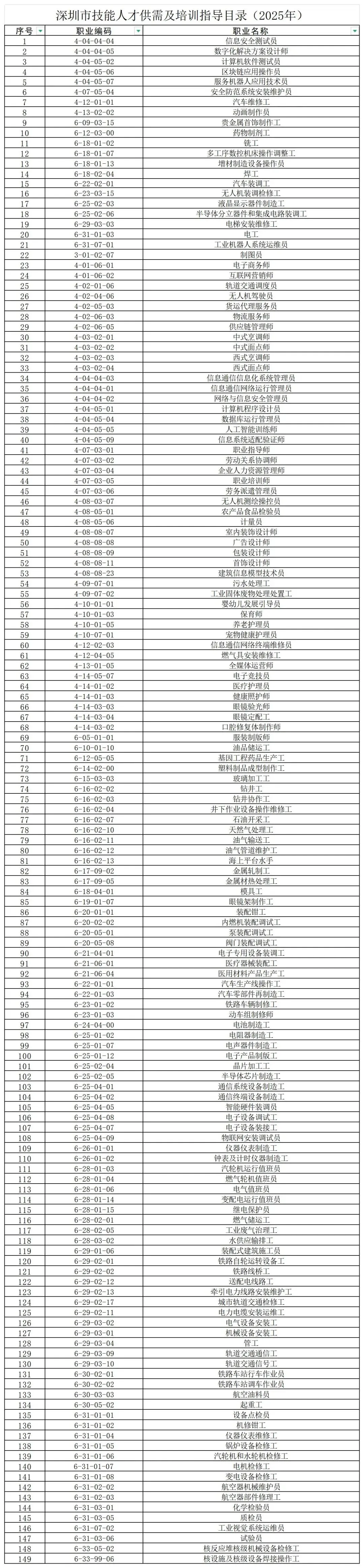 2025公示 深圳紧缺工种目录 !