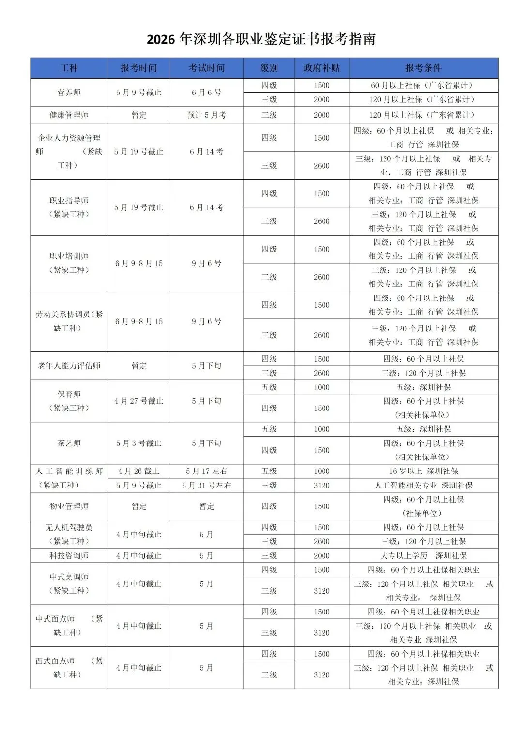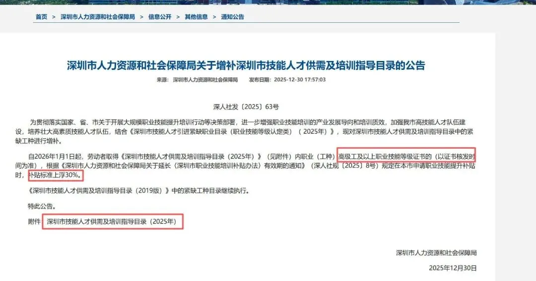 深圳需求的工种, 2026年鼓励大家考证 三级以上 补贴上涨30%