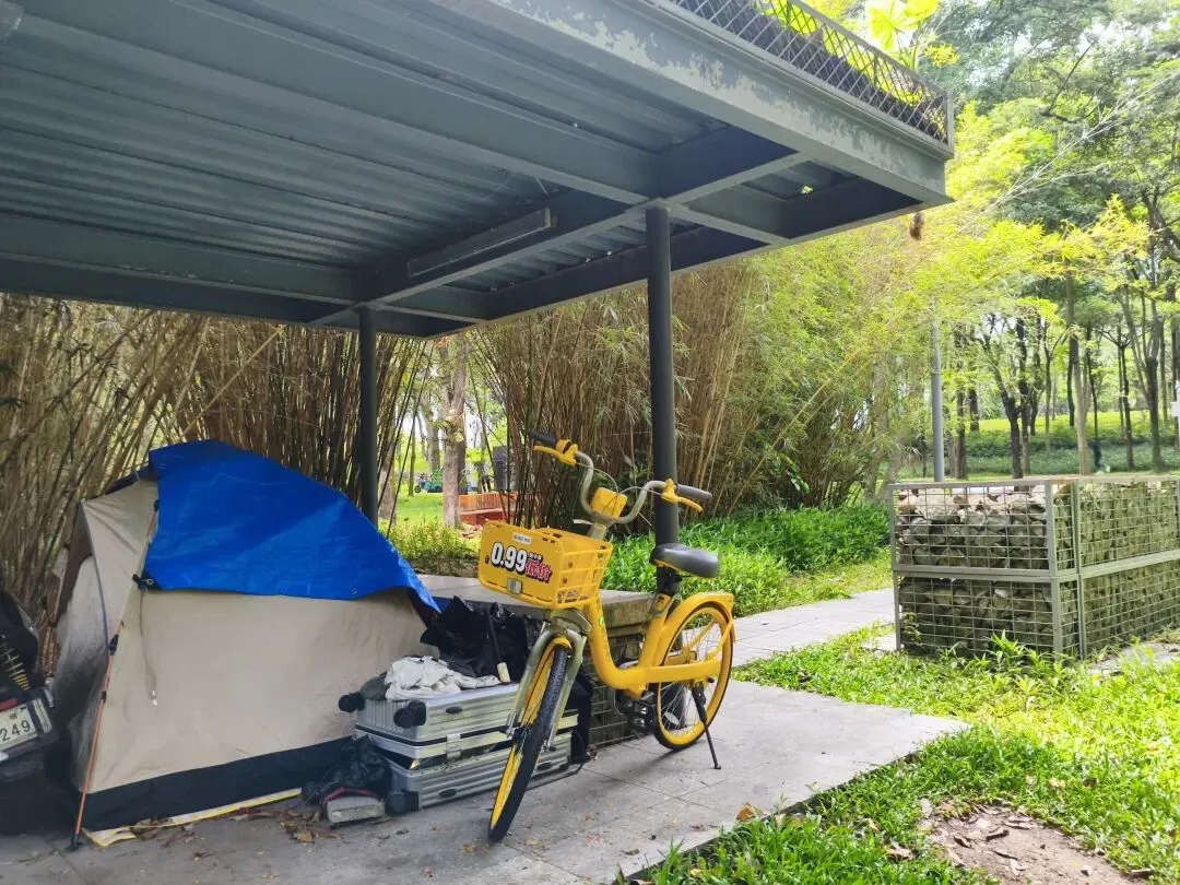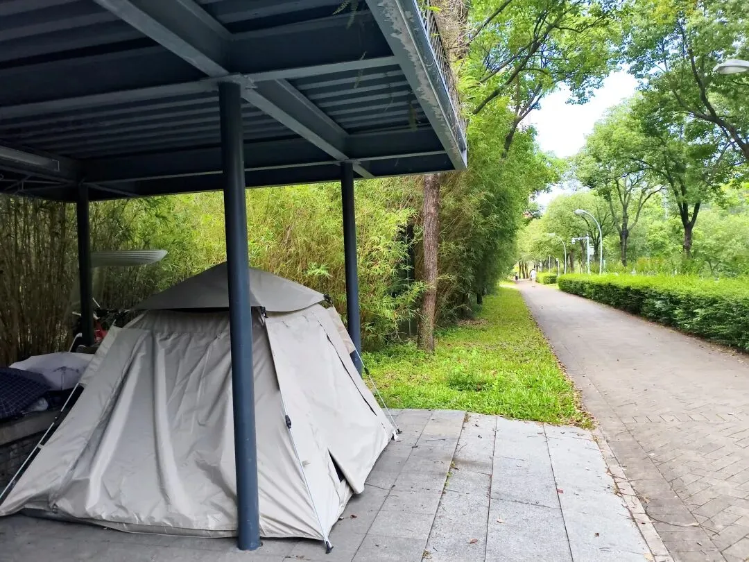 在向日葵公园的廊下,有人搭起帐篷住在这里,还摆放了很多生活用品,