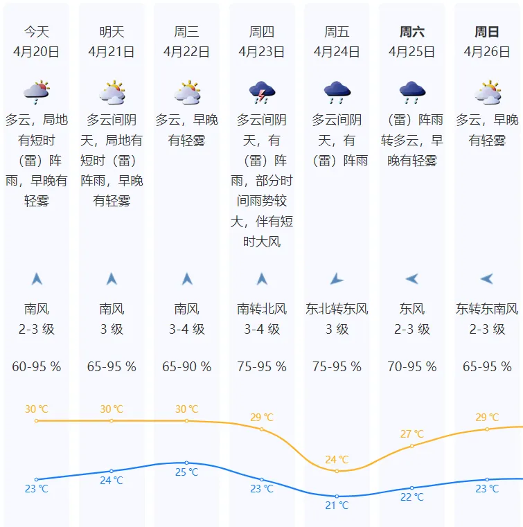 ● 4月20日至24日广东强对流和强降水天气再趋明显。20日,韶关、清远、珠三角西部市县、粤西多云转中雷雨局部暴雨。