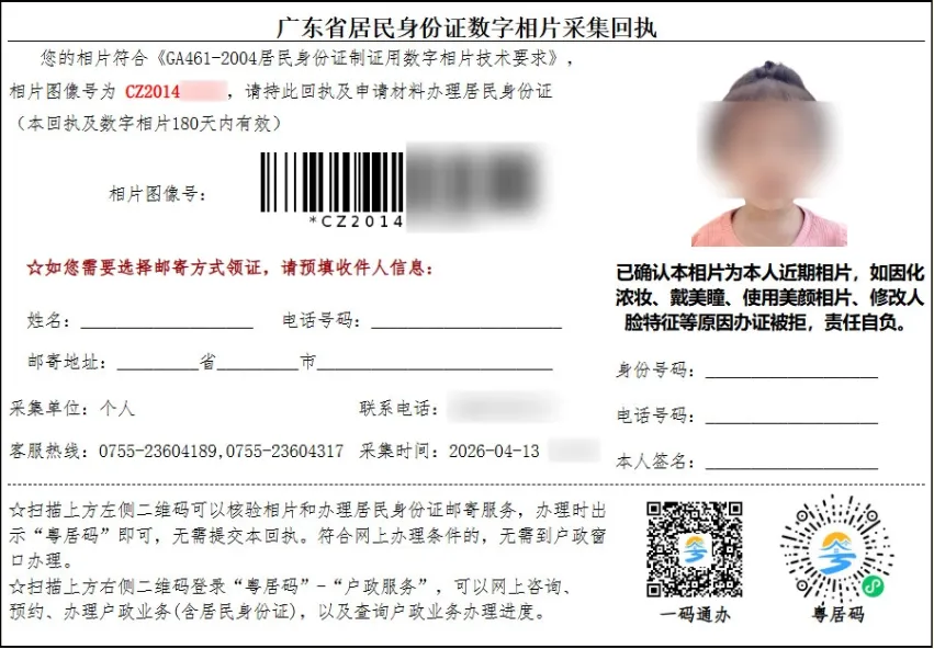 记得带上:户口簿、原身份证(如有)、数字相片采集回执