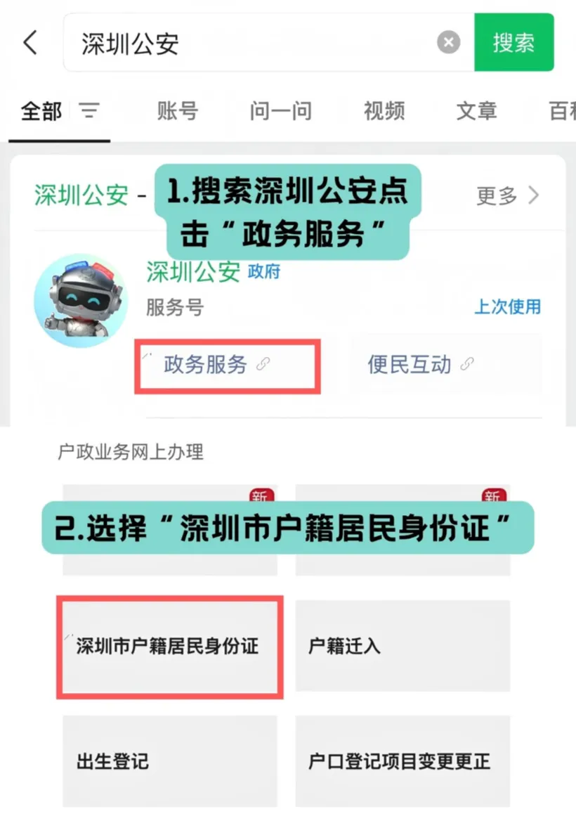 微信搜索“深圳公安”,点击菜单栏“政务服务”进入,选择“深圳市户籍居民身份证/户政全网办”