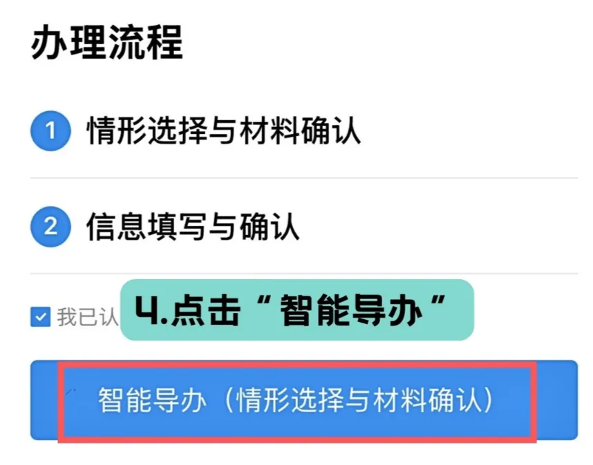 实名认证登录成功之后查看办理指南,点击“智能导办(情形选择与材料确认)”