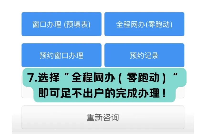 根据自身情况选择申领原因和年龄,符合网上办理条件的居民选择“全程网办(零跑动)”