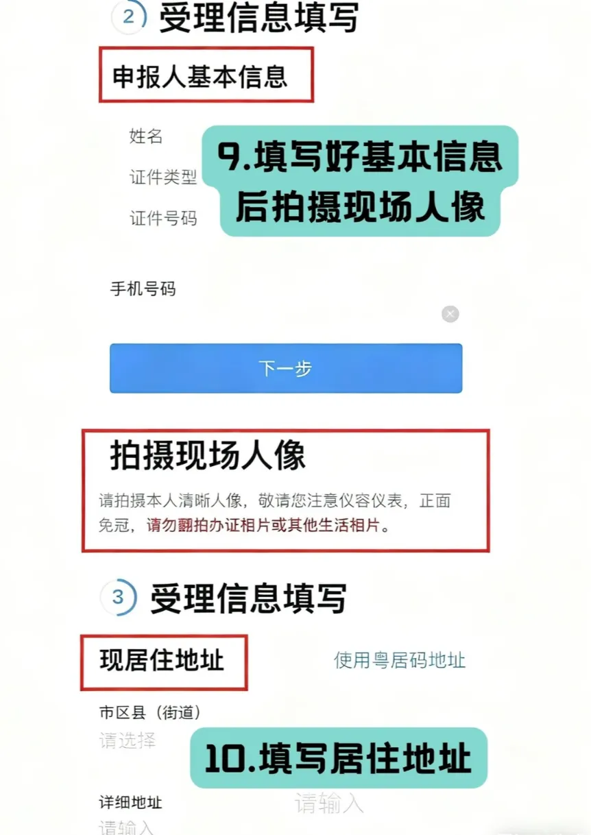 填写申报人的基本信息后拍摄现场人像(人脸识别认证),然后填写现居住地址