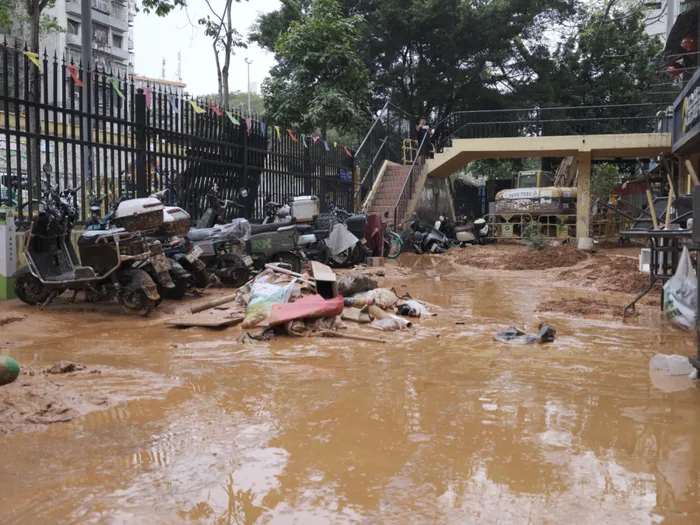 汹涌的大水不仅漫灌路面、淹没十余辆私家车,更导致周边多个小区突发停水。