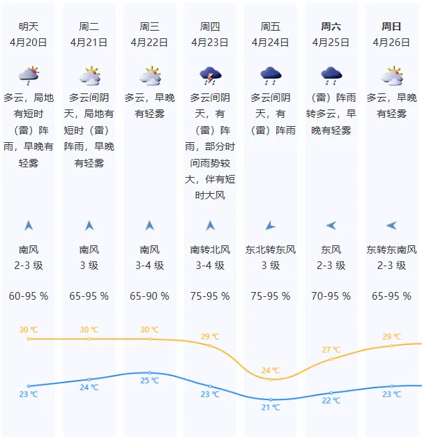 4月20日,韶关、清远、珠三角西部市县、粤西多云转中雷雨局部暴雨,雷雨时伴有8-9级局部10级短时大风和短时强降水,其余市县多云间阴天有分散(雷)阵雨。最高气温:雷州半岛和东部市县30~32℃,其余大部市县26~29℃。