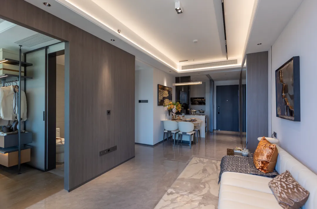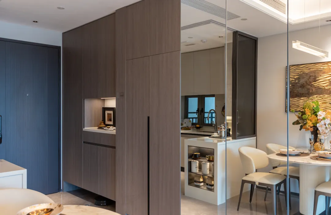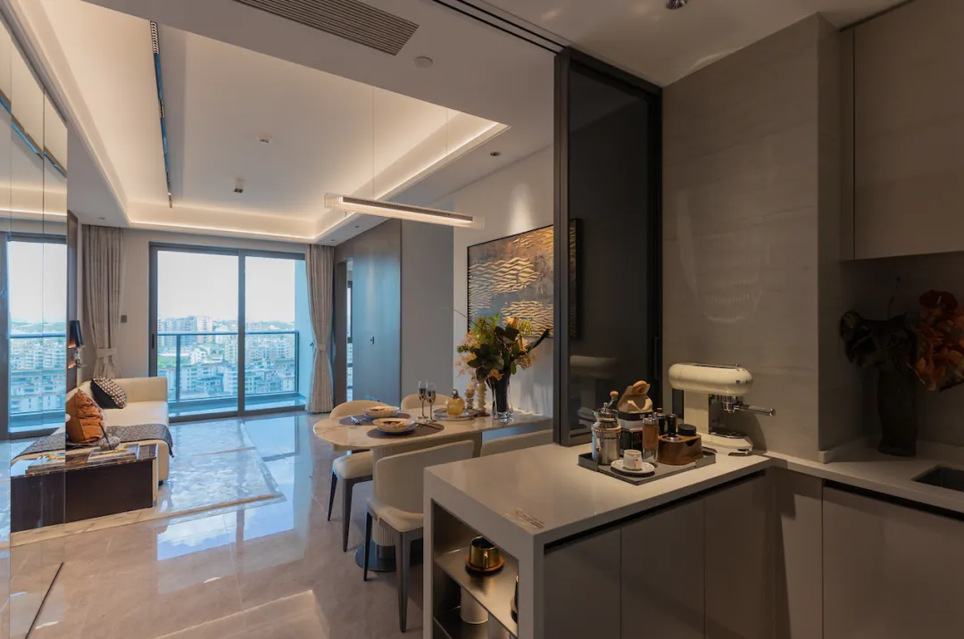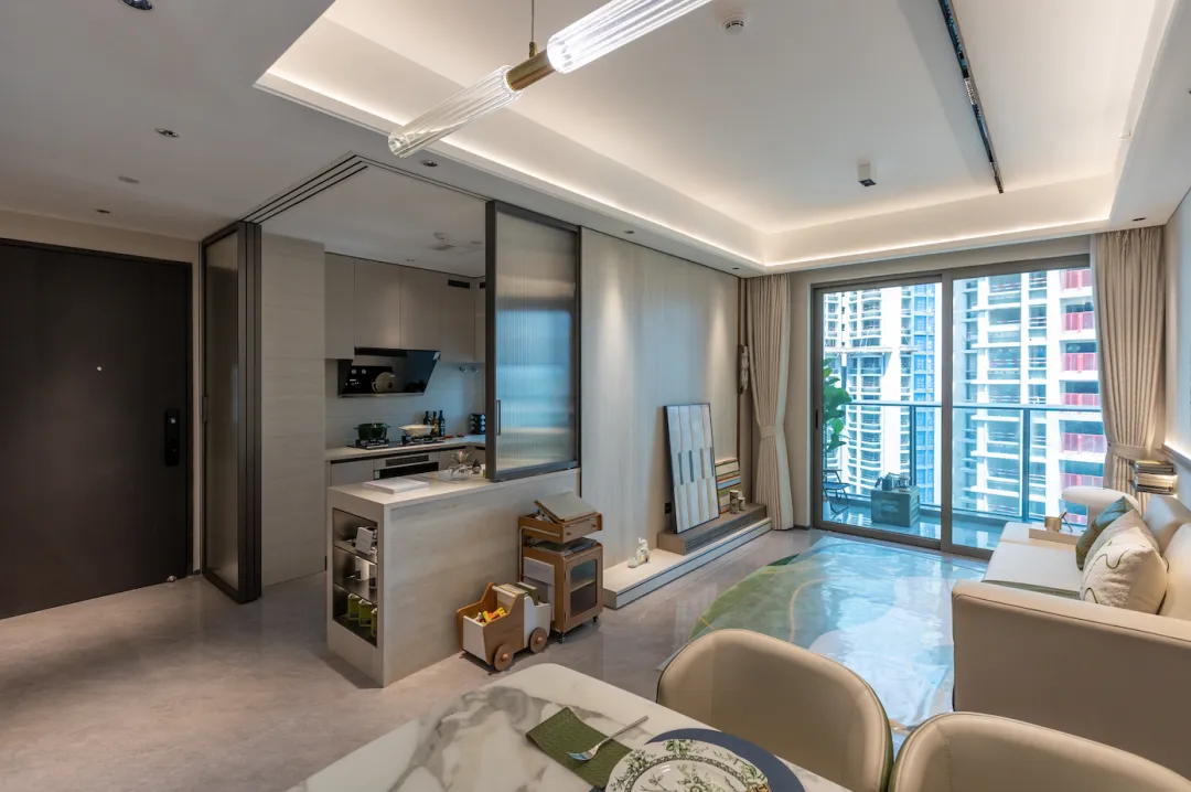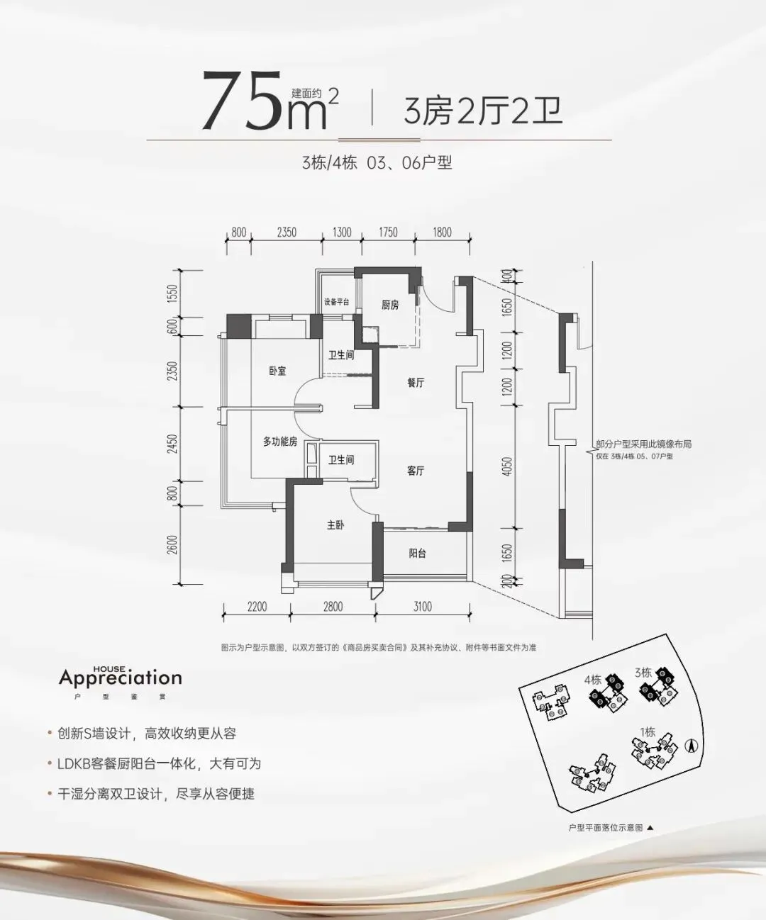 - 75㎡3房2卫:谁说小户型只能将就?S型墙体藏冰箱、干湿分离公卫、180°环幕采光主卧……每个细节都在说“我全都要”!西南向看园林、东北向望观澜河,两种景观随心选。